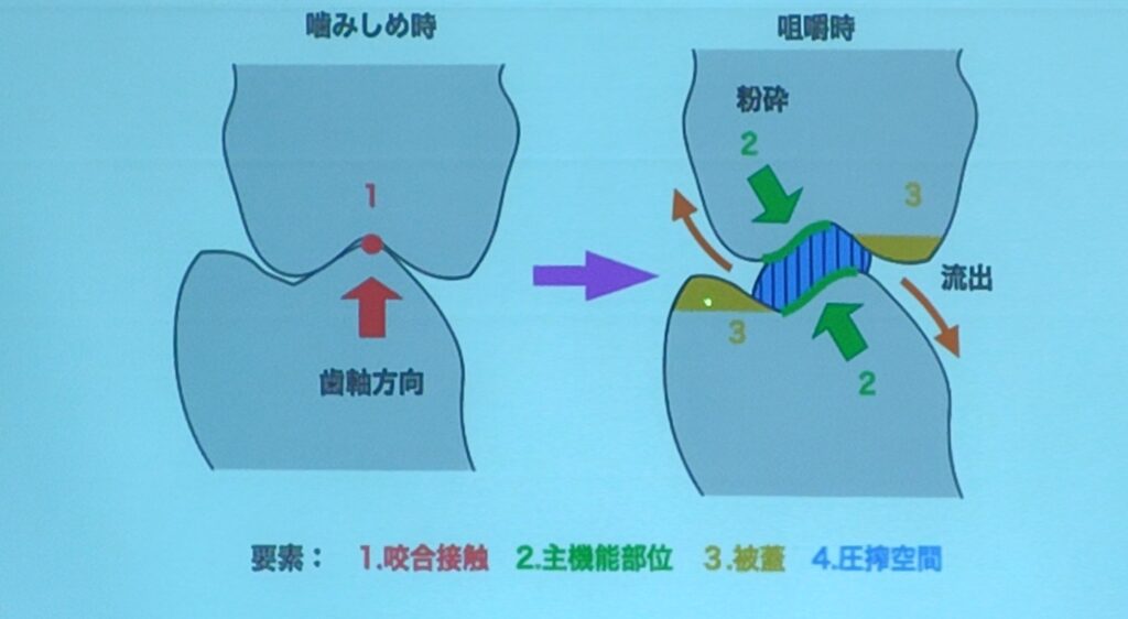 講義では、「機能的な咬合面形態」と健康寿命との関係について「咬頭の削合が咀嚼時の変位様相に及ぼす影響」という実験で、主機能咬頭と被蓋を削合した時の噛みやすさ、食べ物が舌側に流れ、円滑な食事ができるかを調べた結果を用いて、咬合接触、主機能部位、被蓋、圧搾空間、この4つポイントが反映された補綴物を製作することが円滑な食事に大きく関わるとわかりました。