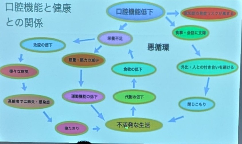 歯が悪くなると食事や会話に支障がでたり、外出や人との付き合いを避ける、偏った食事による栄養不足、筋力の減少、高齢者では肺炎や感染症など、心身の健康の悪循環に陥ります。『健康寿命』は、継続的な介護や支援を必要とせず日常生活を送れる期間を指し、口腔機能はこの期間の延伸大きく影響します。