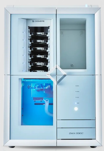 今回導入した加工機は、DWX-53DCという機械で、ジルコニア、ワックス、PMMA(レジン系の材料)、ハイブリッドレジン、PEEK、CoCrシンターメタル、グラスファイバー強化型レジンが加工でき、6つのディスクを自動交換可能して夜間無人運転に対応しているため、より多くの技工物の加工ができるようになり、また従来の加工機に比べ、機体補正プログラムが強化され、加工精度がより向上され、新設計のスピンドルは高負荷切削でも安定した加工を実現、フレーム剛性強化との相乗効果でレジン系材料の効率的な加工が可能となりました。